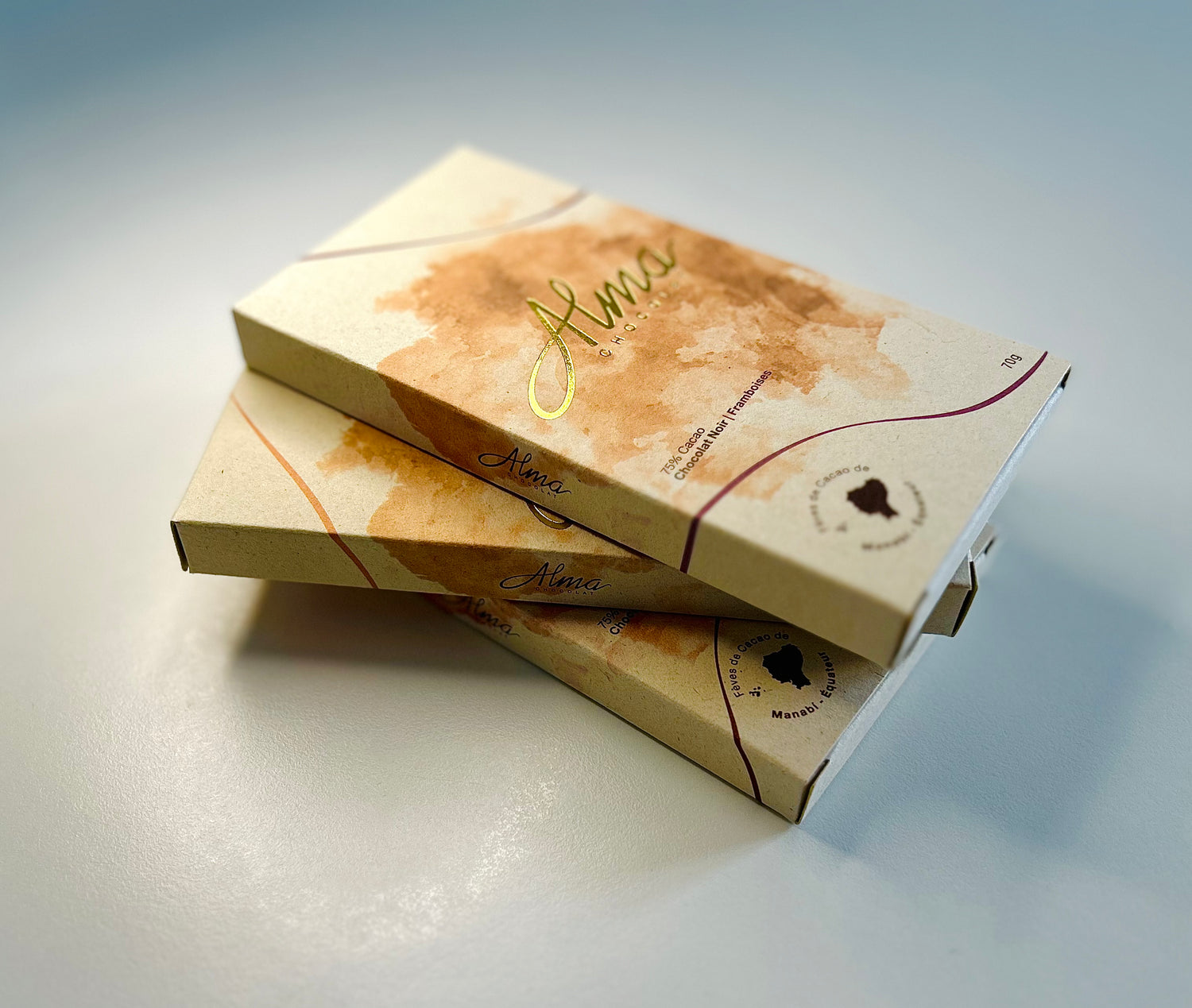 Chaque tablette Alma est soigneusement enveloppée dans un écrin raffiné, reflet du respect que nous portons à la noblesse du cacao Arriba de Manabí.